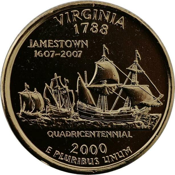 R1405 USA Virginia Quarter 1/4 Dollar Jamestown 1788 2000 Gold Plated UNC >Offer