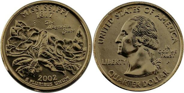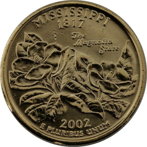 R1407 USA Mississippi Quarter 1/4 Dollar Magnollia 1817 2002 Gold Plated UNC