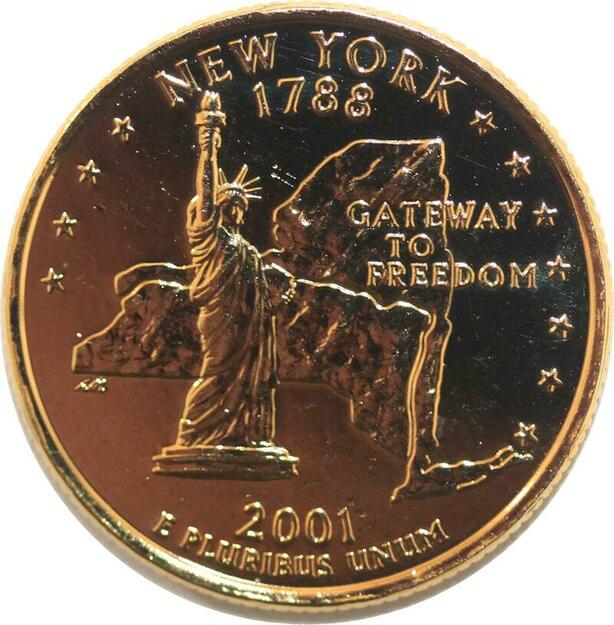 R1806 USA New York Quarter 1/4 Dollar Gateway Freedom 1788 2001 Gold Plated UNC