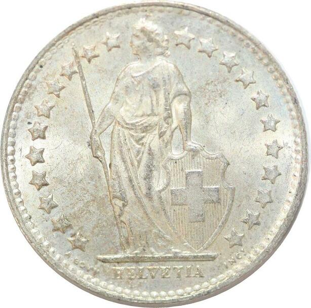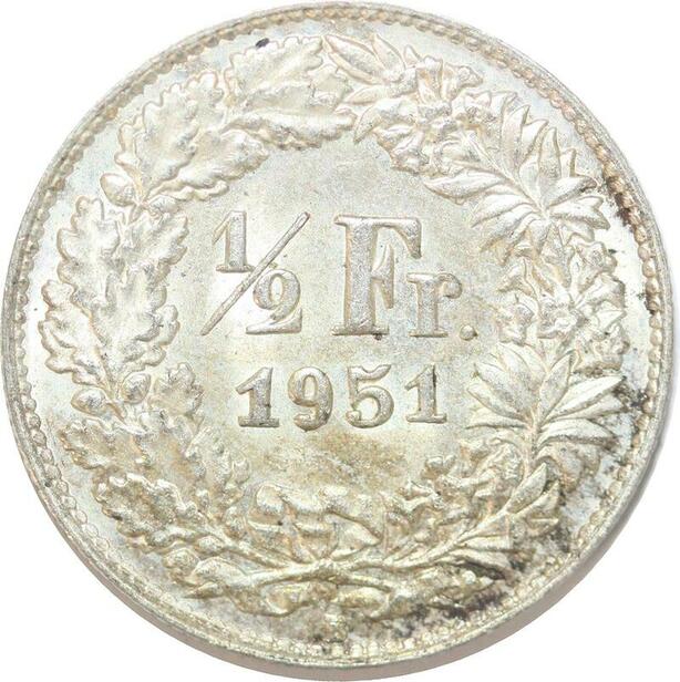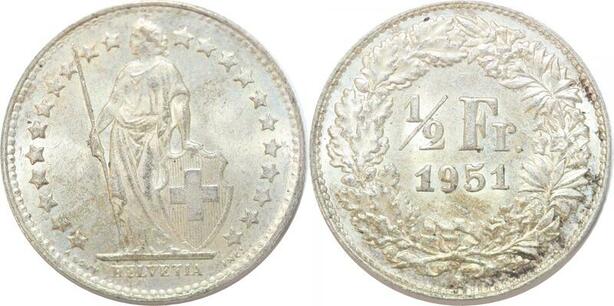 R1867 Suisse Switzerland 1/2 Franc Helvetia 1951 B Berne Silver AU+ > Make Offer