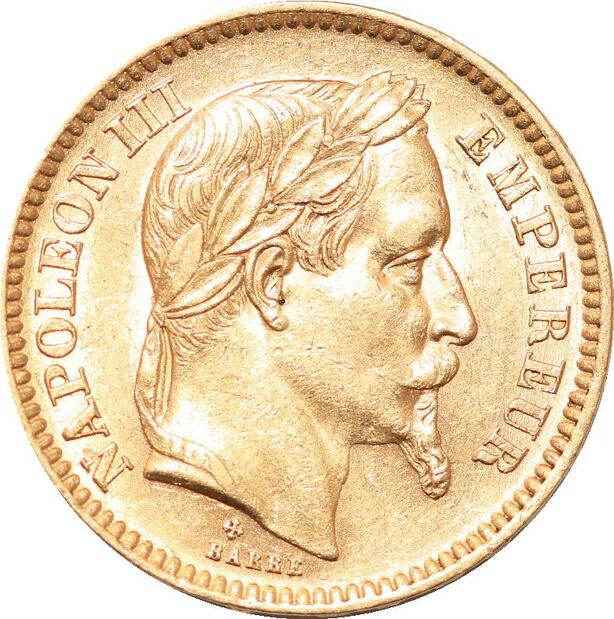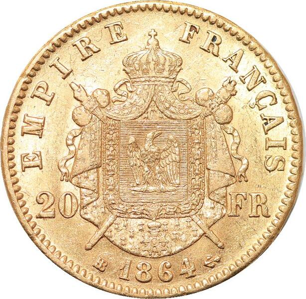 R1920 Rare France 20 Francs Napoléon III 1864 Petit BB Strasbourg Or Gold UNC