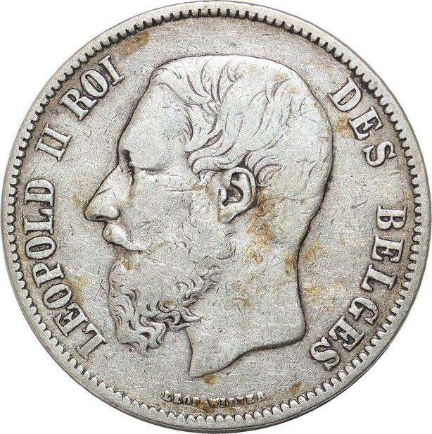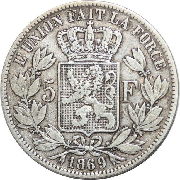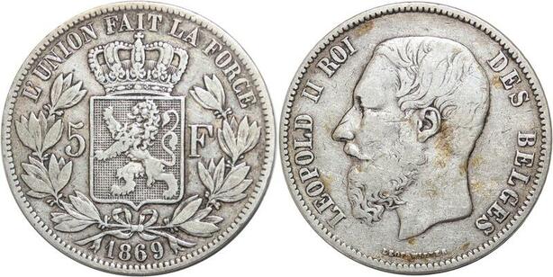 R3085 Belgium 5 Francs Leopold II Wiener 1869 Argent > Make Offer
