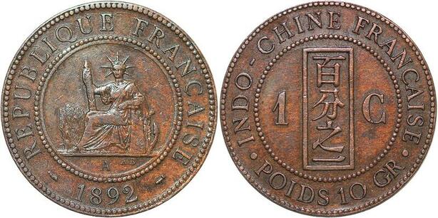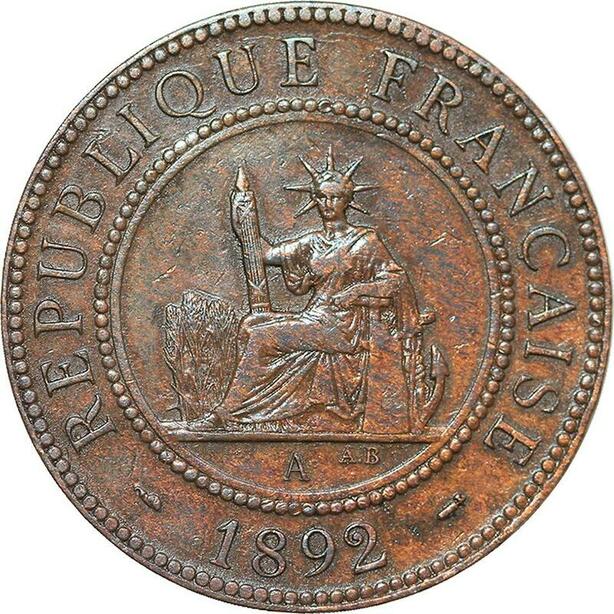 R3405 Rare French Indochina 1 Cent Liberty 1892 A Paris AU+ -> Make Offer