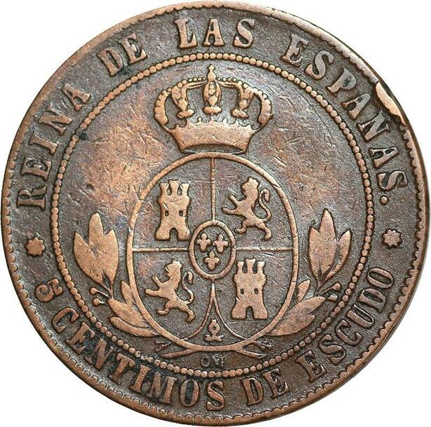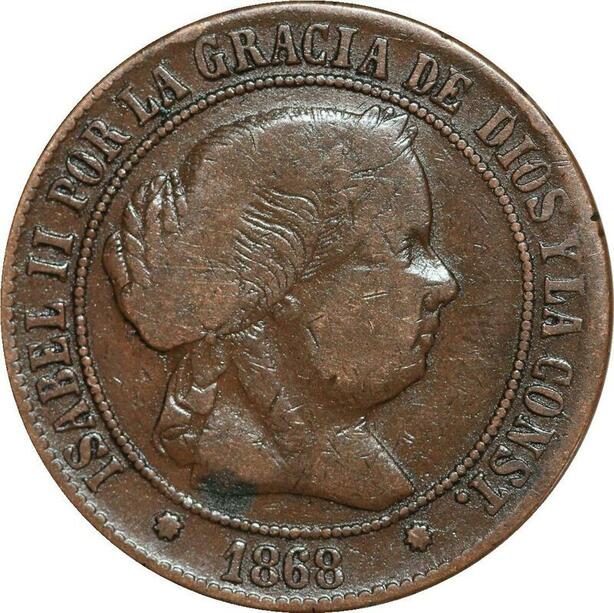 R3897 Spain 5 Centimos Isabel II 1868 OM 8 pointed star Barcelona -> Make Offer