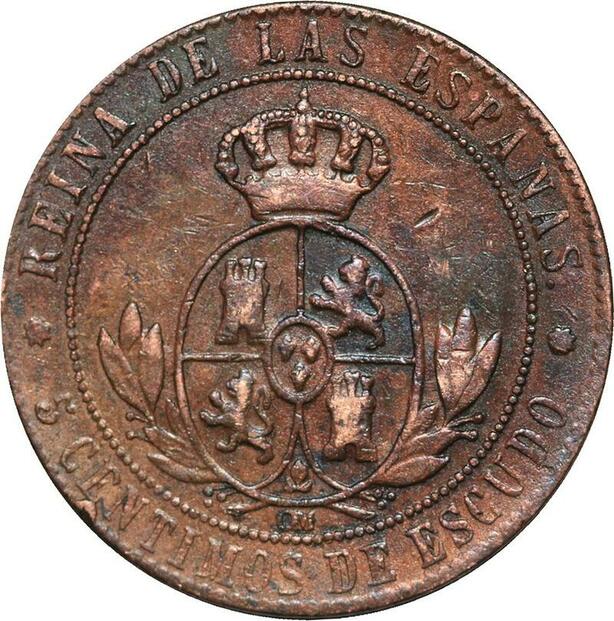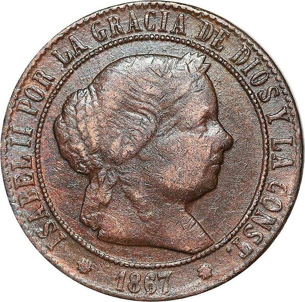 R3912 Spain 5 Centimos Isabel II 1867 OM 8 pointed star Barcelona -> Make Offer