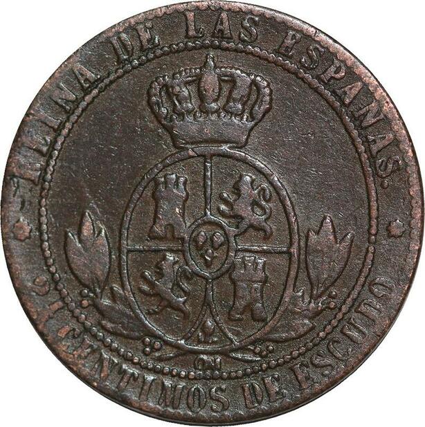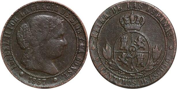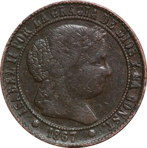 R3927 Spain 2 1/2 Centimos Isabel II 1867 OM 8 pointed star Barcelona -> M Offer