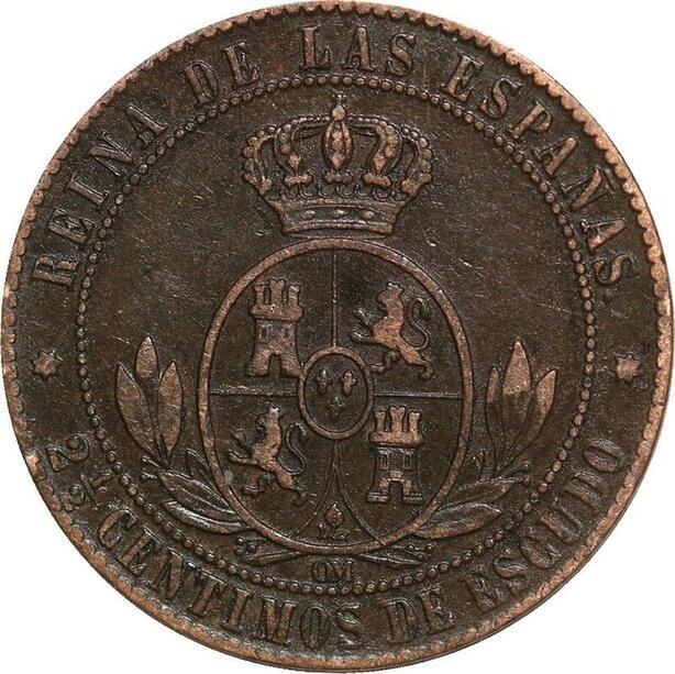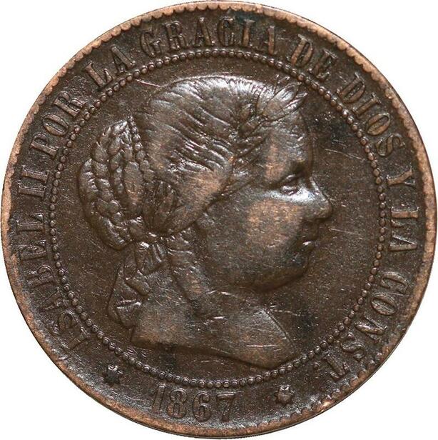 R3929 Spain 2 1/2 Centimos Isabel II 1867 OM 7 pointed star Sevilla -> M Offer