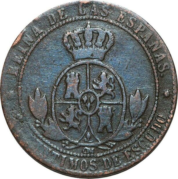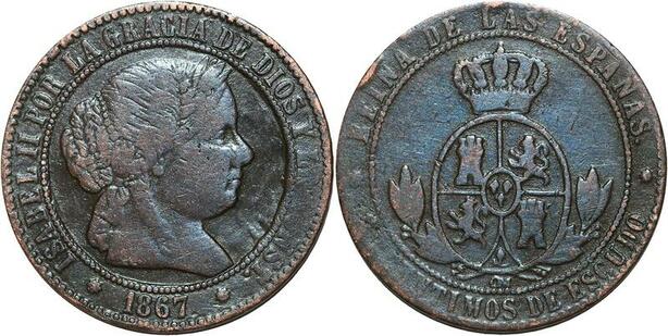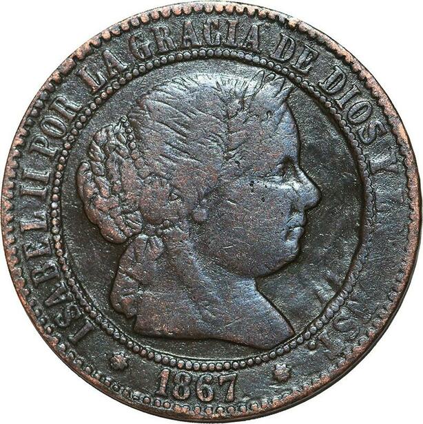 R3945 Spain 2 1/2 Centimos Isabel II 1867 OM 7 pointed star Sevilla -> M Offer