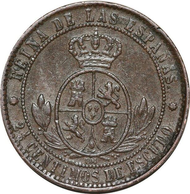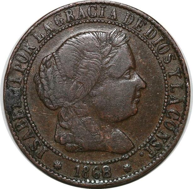 R3948 Spain 2 1/2 Centimos Isabel II 1868 OM 7 pointed star Sevilla -> M Offer