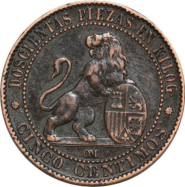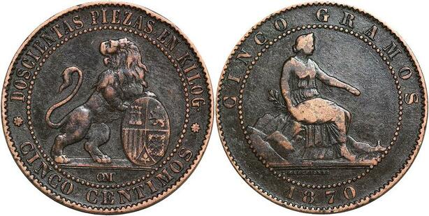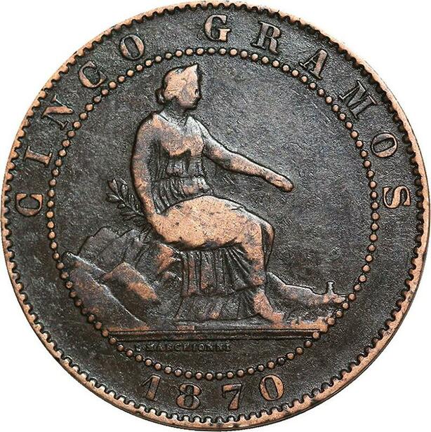 R3966 Spain 5 Centimos Provisional Government 1870 OM 8 pointed star Barcelona