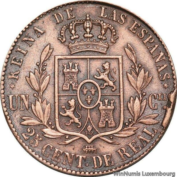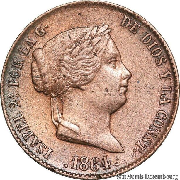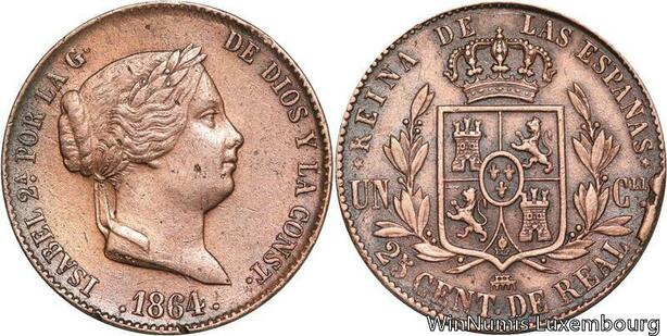 R4014 Rare Spain 25 Centimos Isabel II 1864 Segovia UNC -> Make offer