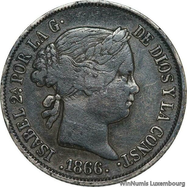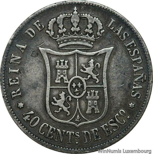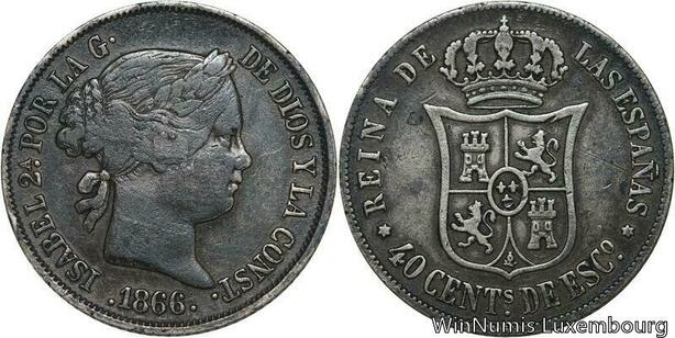R4773 Spain 40 Centimos Escudo Isabel II 1866 Madrid 6 pointed star Silver