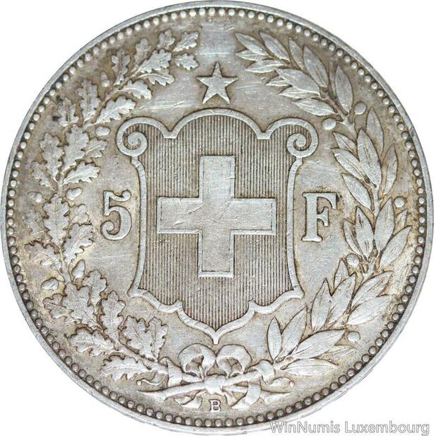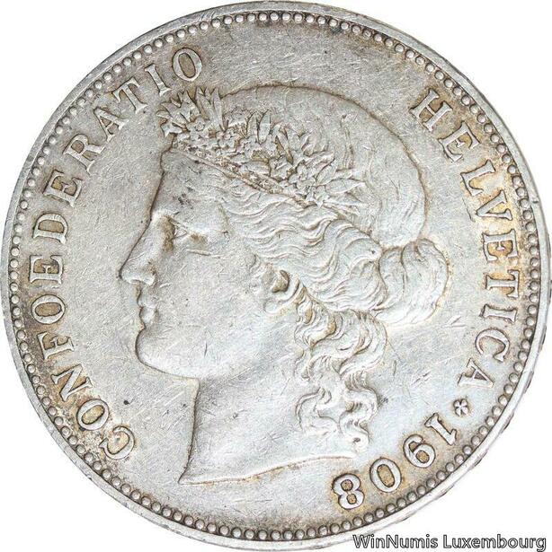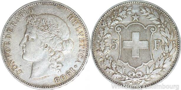 R5005 Rare Switzerland 5 Francs Helvetia 1908 B Berne Argent Silver ->Make offer