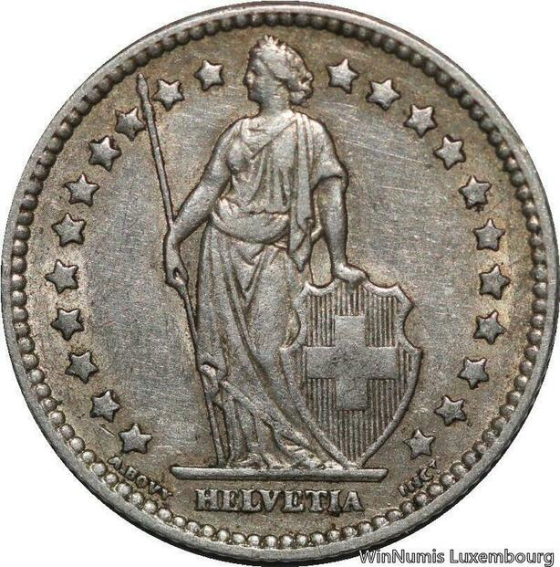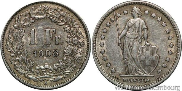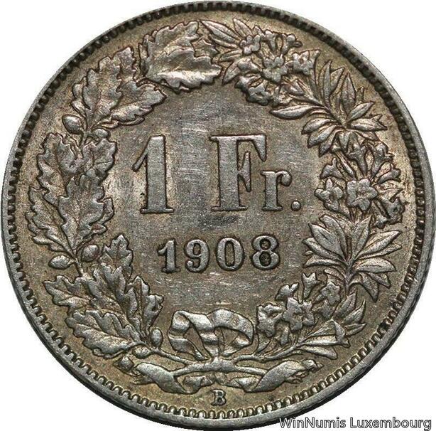 R5068 Rare Switzerland 1 Franc Helvetia 1908 B Berne Silver AU -> Make offer