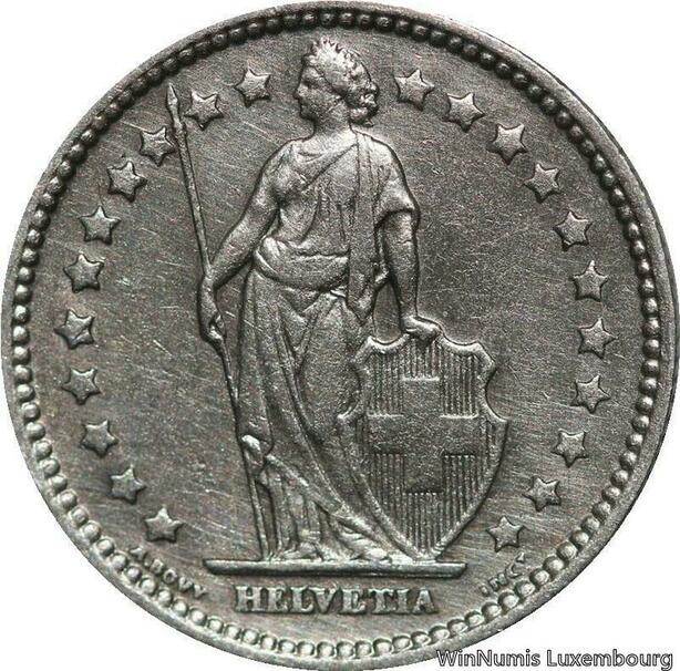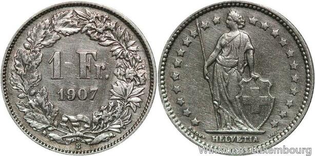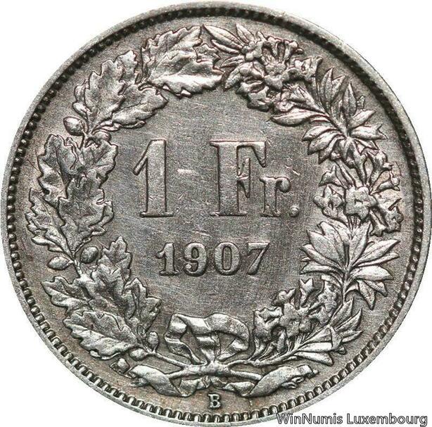 R5074 Rare Switzerland 1 Franc Helvetia 1907 B Berne Silver UNC -> Make offer