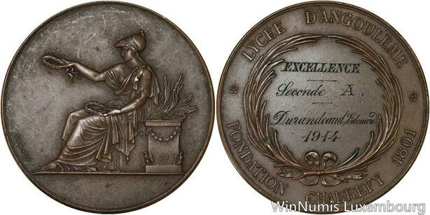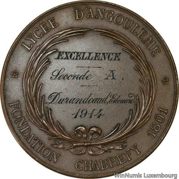 R5258 Médaille Athena Fondation Chabrefy Lycée Angoulème Durandeaud Edouard 1914