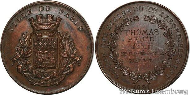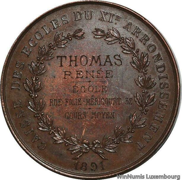 R5547 Médaille Caisse Ecoles Thomas Renée 32 Rue Folie Méricourt 1891 Paris SUP