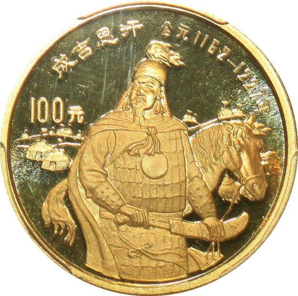 AA036 Rare China 100 Yuan Genghis Khan 1989 Or Gold PCGS PR68 Deep Cameo Proof
