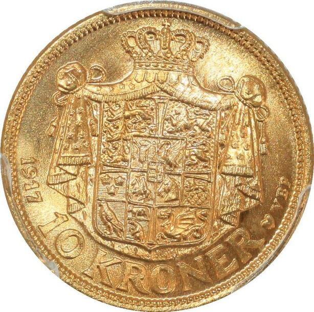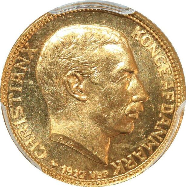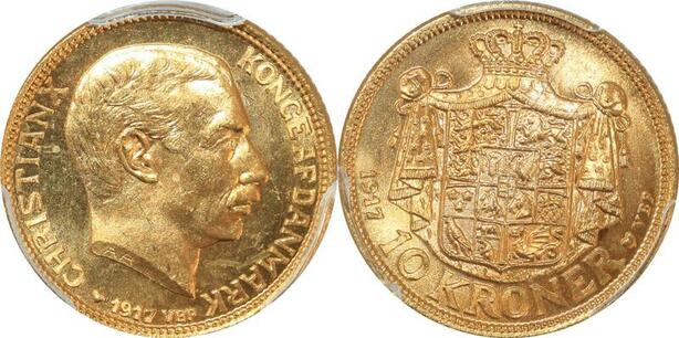 AA504 Denmark 10 Kroner Christian X 1917 VBP Or Gold PCGS MS65 ->Make offer