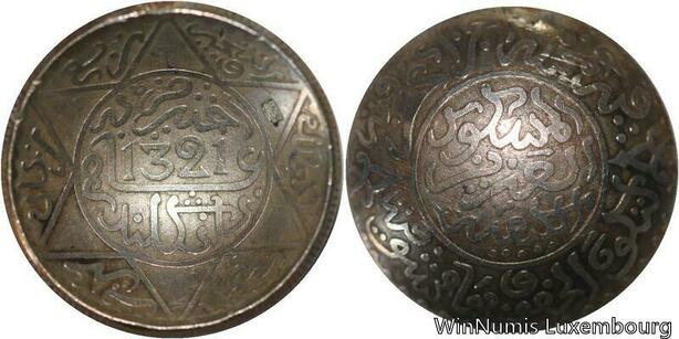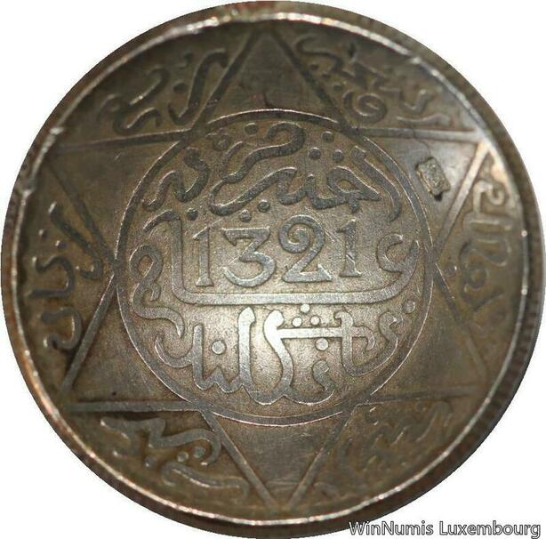 R6604 Morocco 2 1/2 Dirhams 1/4 Rial Abdel Aziz 1320 1903 Silver London Curved