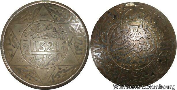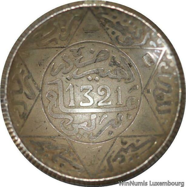 R6614 Morocco 2 1/2 Dirhams 1/4 Rial Abdel Aziz 1321 1903 Silver Berlin Curved