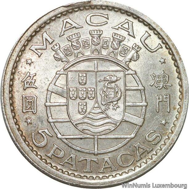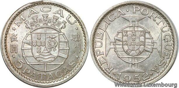 R7010 Macau Portuguese Colony 5 Patacas 1952 Silver AU+ -> Make offer