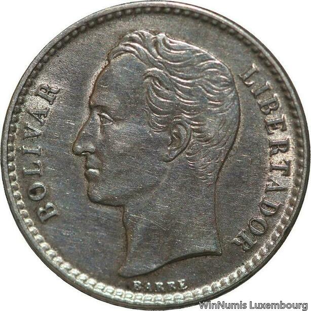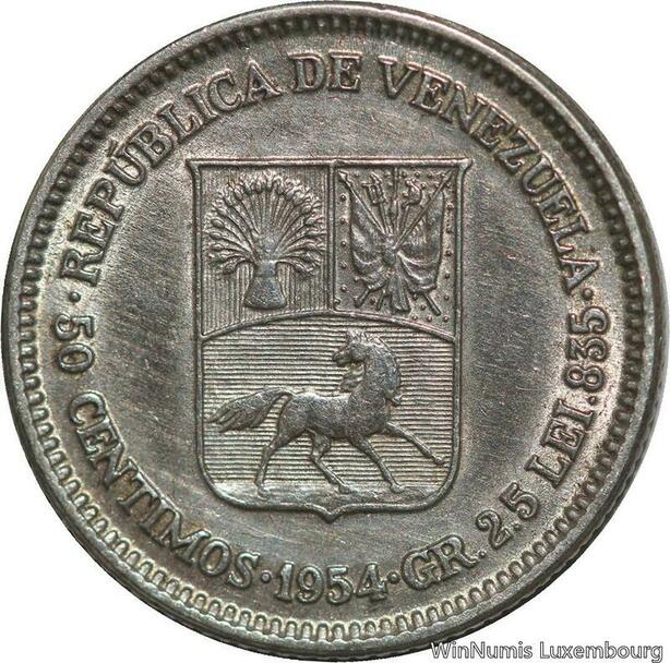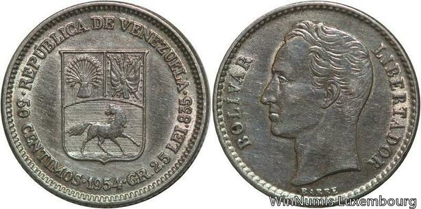 R7072 Venezuela 50 Centimos 1954 Philadelphia Silver AU -> Make offer