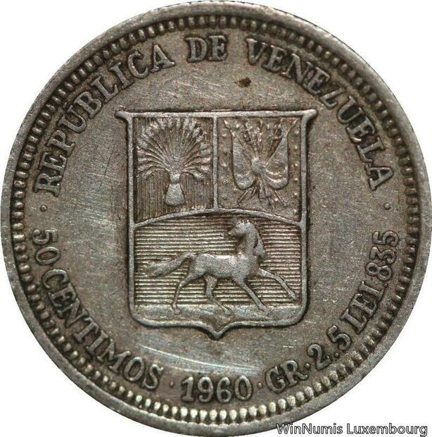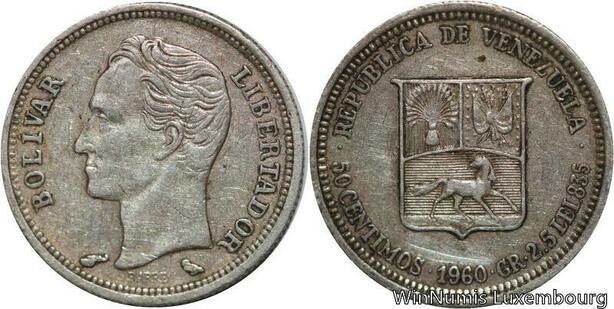 R7073 Venezuela 50 Centimos Bolivar 1960 A Paris Silver -> Make offer