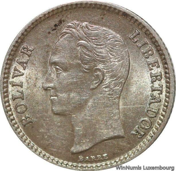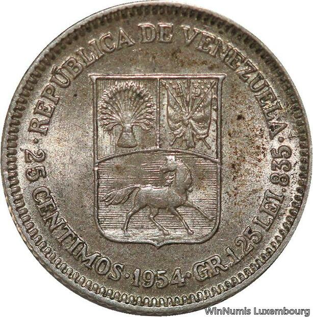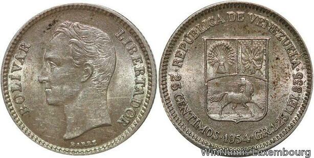 R7079 Venezuela 25 Centimos 1954 Silver AU -> Make offer