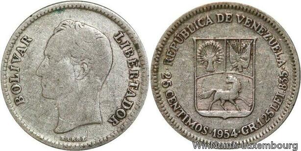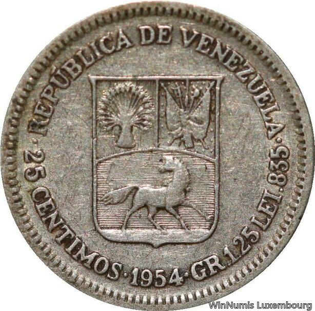R7080 Venezuela 25 Centimos 1954 Silver -> Make offer