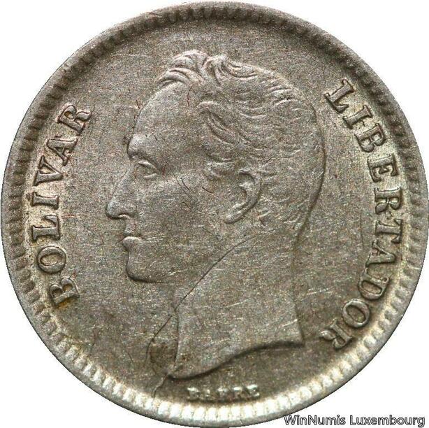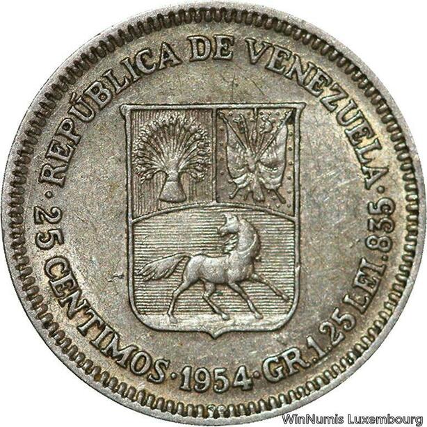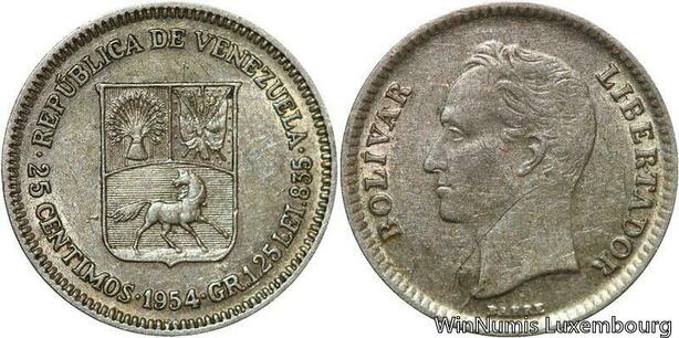 R7082 Venezuela 25 Centimos 1954 Silver AU -> Make offer