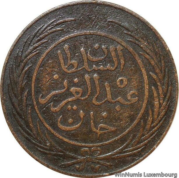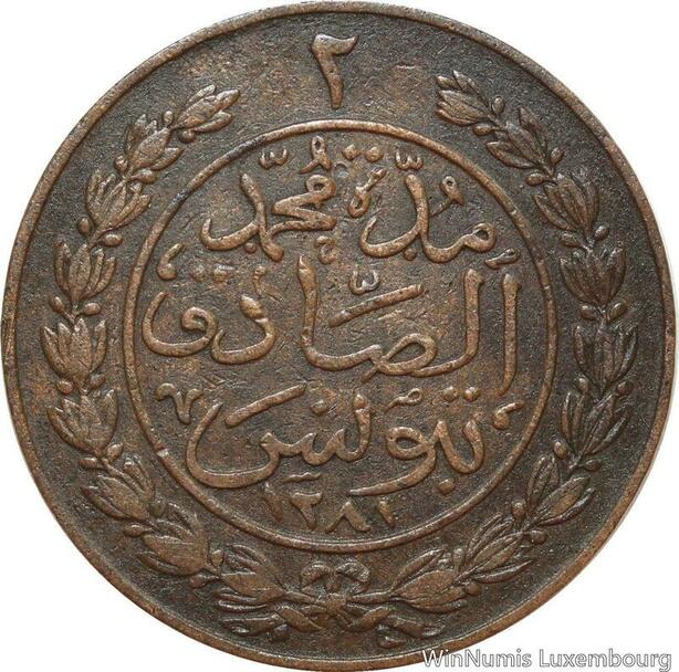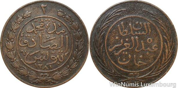 R7412 Tunisia 2 Kharubs Sultan Abdul Aziz Bey Muhammad al-Sadiq AH 1281 1865
