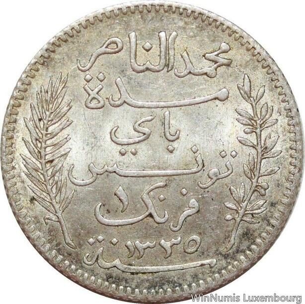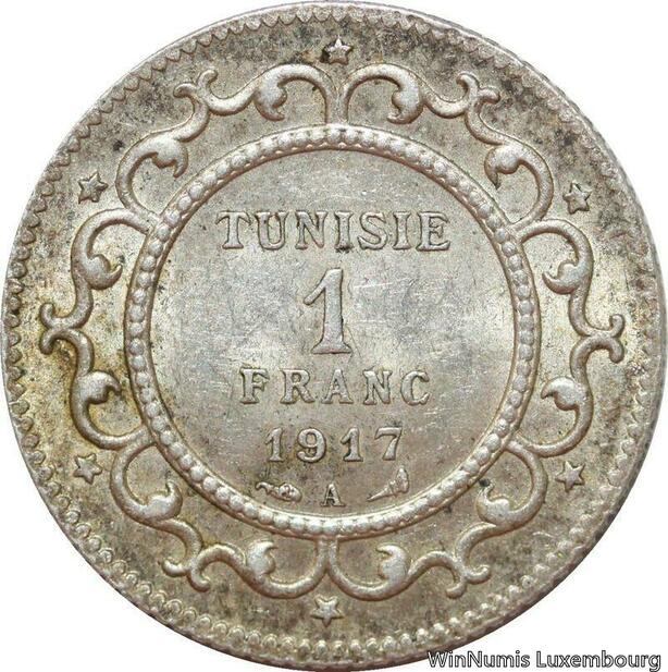 R7440 Tunisia 1 Franc Muhammad al-Nasir Protectorat 1335 1917 A Paris Silver AU