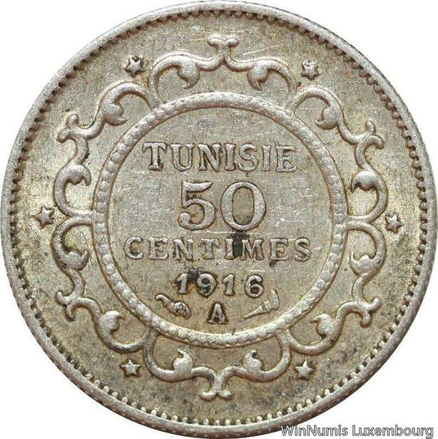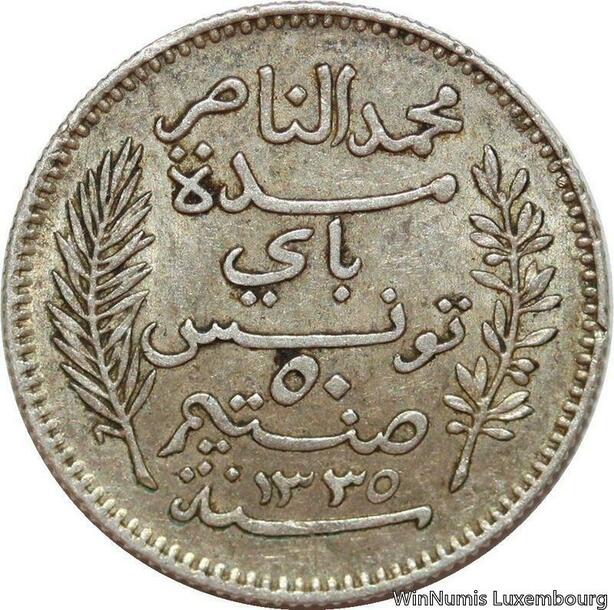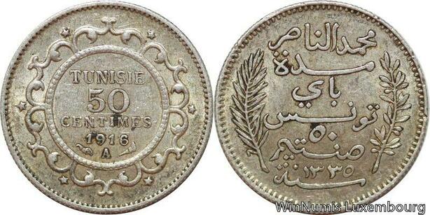 R7446 Tunisia 50 Centimes Muhammad al-Nasir Bey AH 1335 1916 A Paris Silver