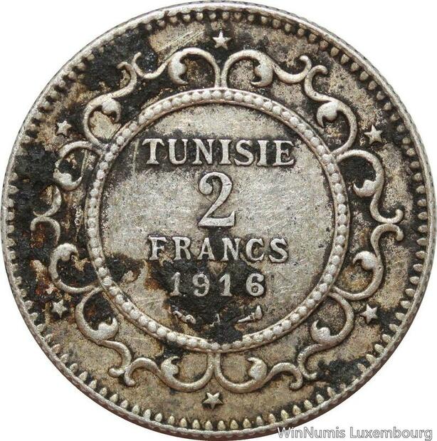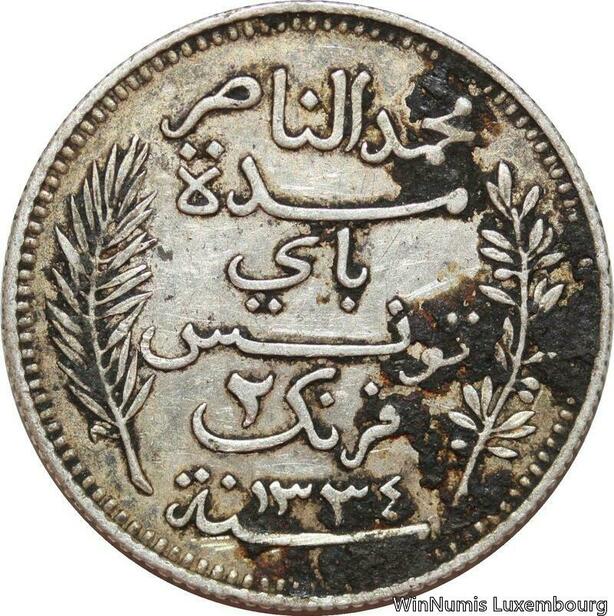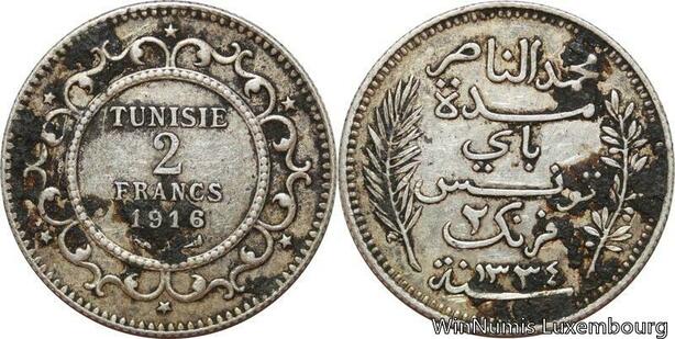R7450 Tunisia 2 Francs Muhammad al-Nasir Bey AH 1334 1916 A Paris Silver > Offer