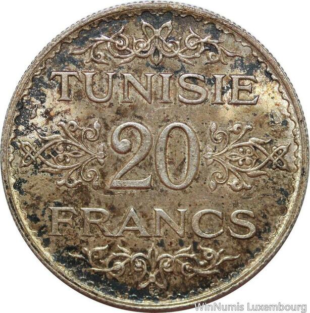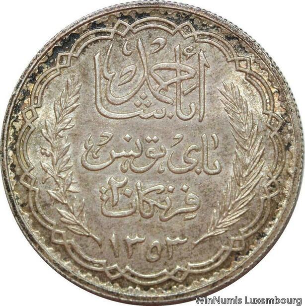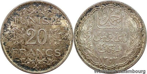R7451 Tunisia 20 Francs Ahmad Pasha AH 1353 1934 A Paris Silver AU -> Make offer