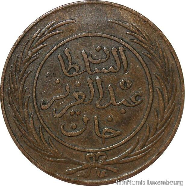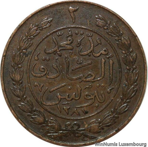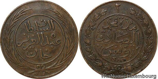R7486 Tunisia 2 Kharubs Sultan Abdul Aziz Bey Muhammad al-Sadiq AH 1281 1865