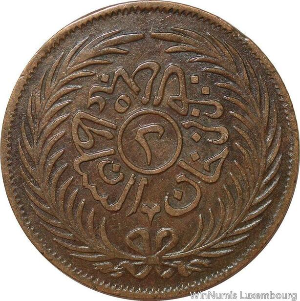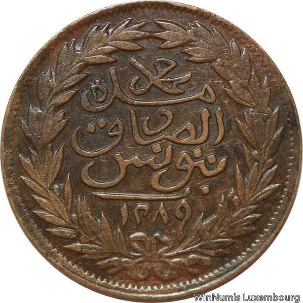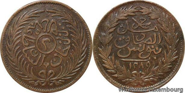 R7489 Tunisia 2 Kharubs Sultan Abdul Aziz Bey Muhammad al-Sadiq AH 1289 1872