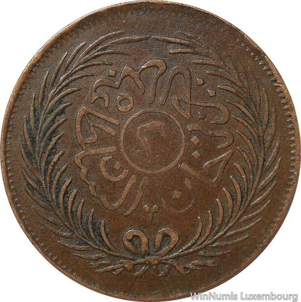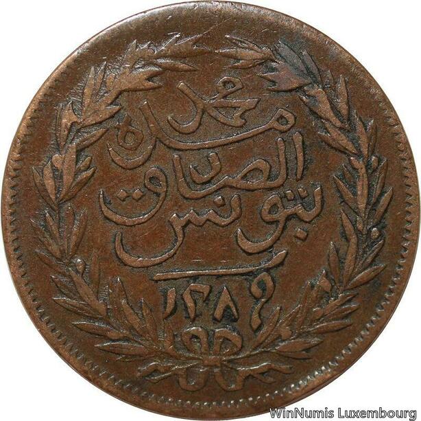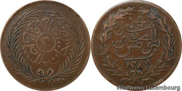 R7490 Tunisia 2 Kharubs Sultan Abdul Aziz Bey Muhammad al-Sadiq AH 1289 1872
