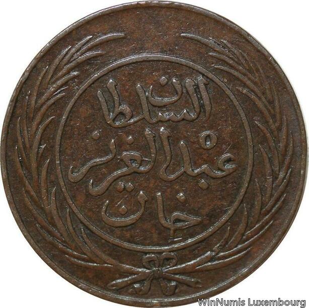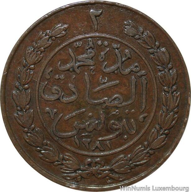 R7496 Tunisia 2 Kharubs Sultan Abdul Aziz Bey Muhammad al-Sadiq AH 1281 1865