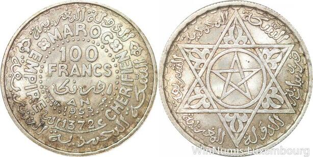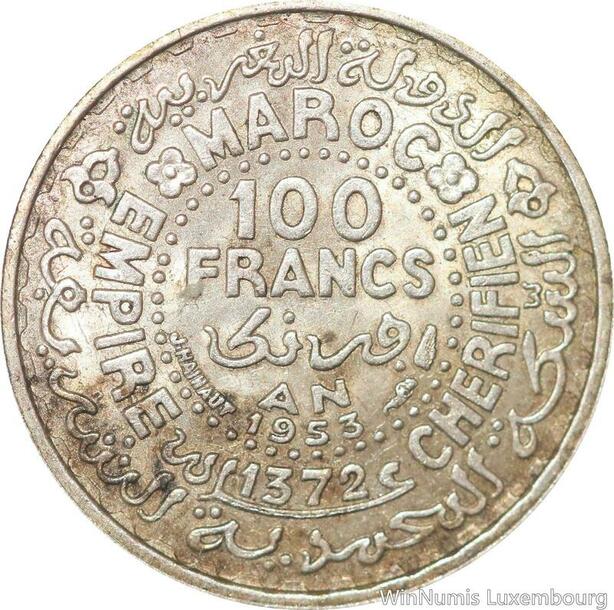 R7520 Morocco 100 Francs Mohammed V AH 1372 1953 Paris Silver AU -> Make offer