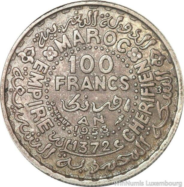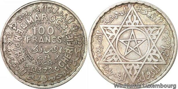R7521 Morocco 100 Francs Mohammed V AH 1372 1953 Paris Silver AU -> Make offer