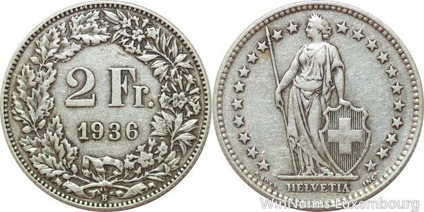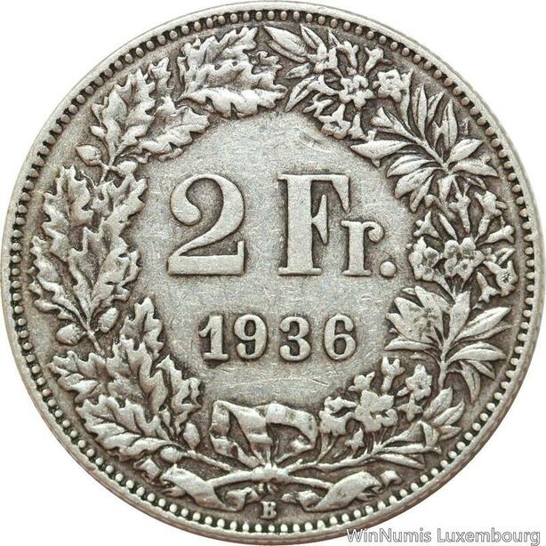 R7693 Switzerland 2 Francs Helvetia 1936 B Berne Silver -> Make offer