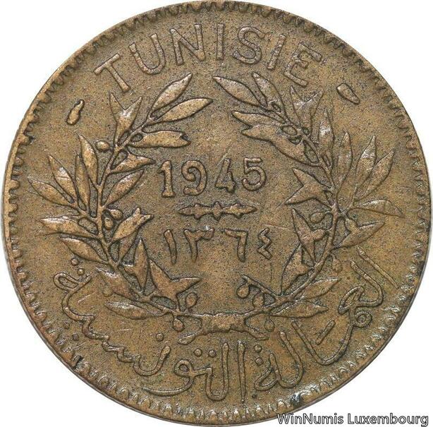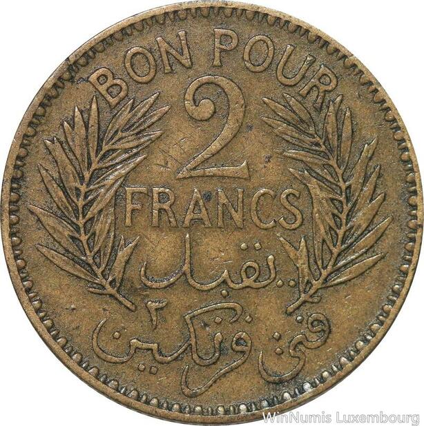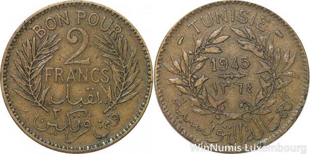 R8039 Tunisia 2 Francs AH 1365 1945 A Paris -> Make offer