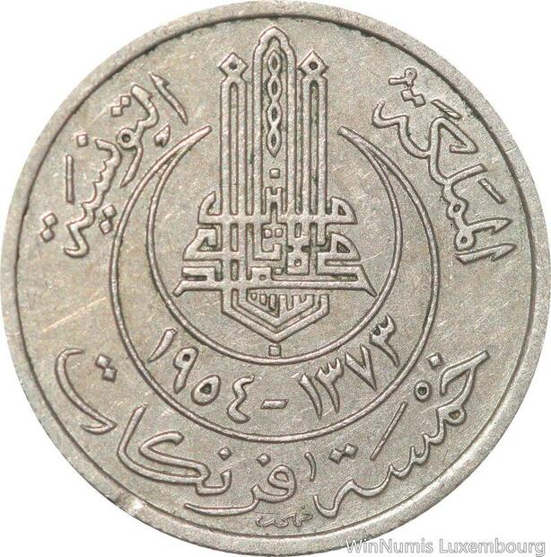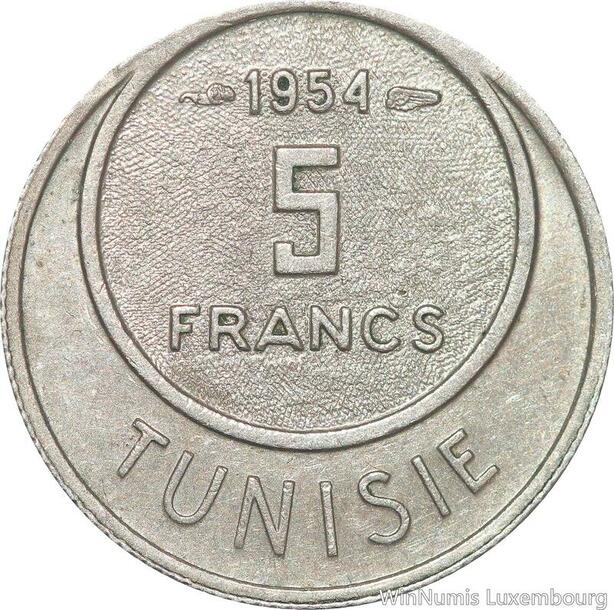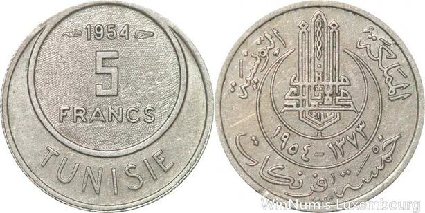 R8088 Tunisia 5 Francs Muhammad al-Amin Bey AH 1373 1954 Paris AU