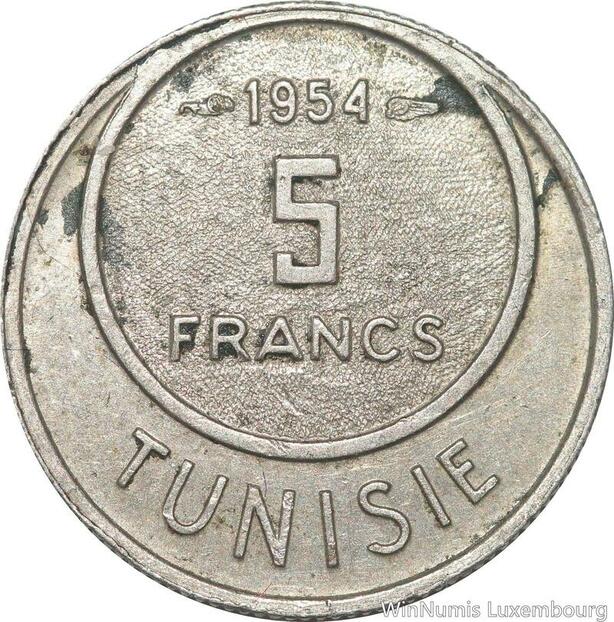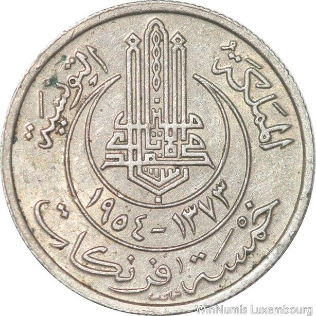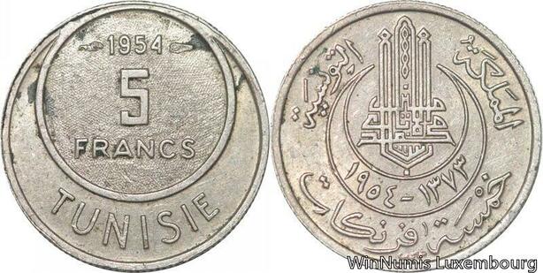 R8089 Tunisia 5 Francs Muhammad al-Amin Bey AH 1373 1954 Paris