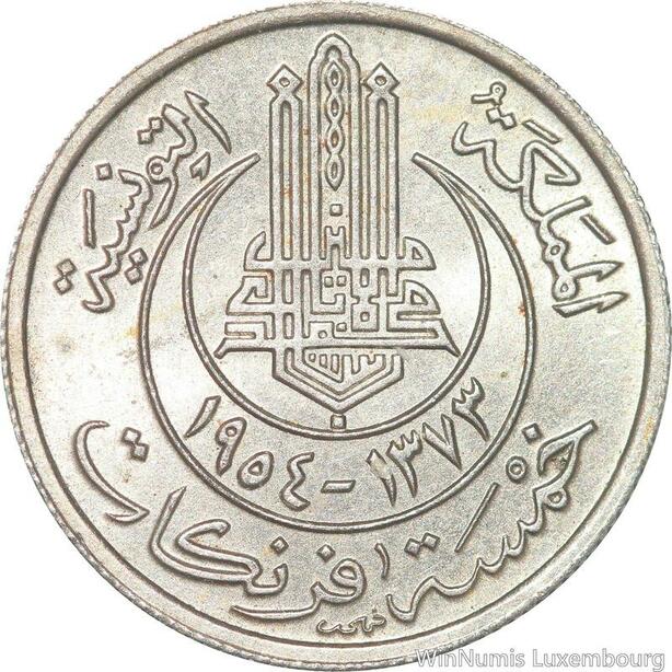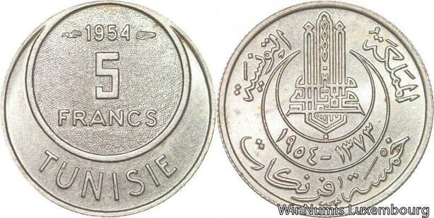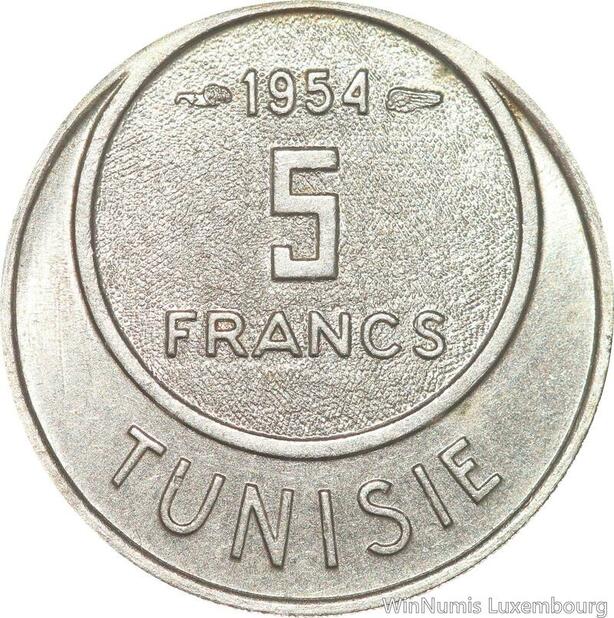 R8091 Tunisia 5 Francs Muhammad al-Amin Bey AH 1373 1954 Paris UNC