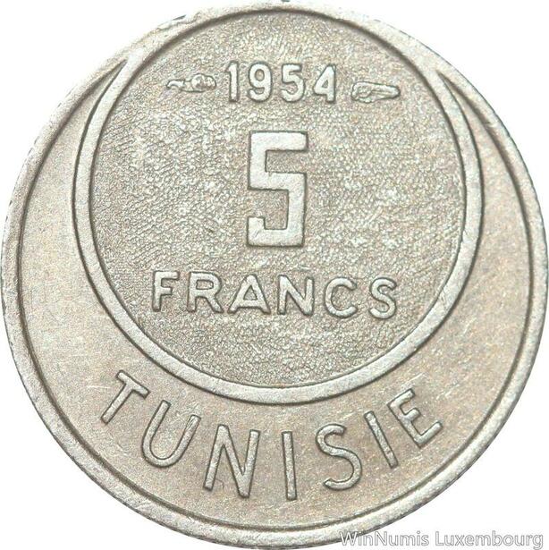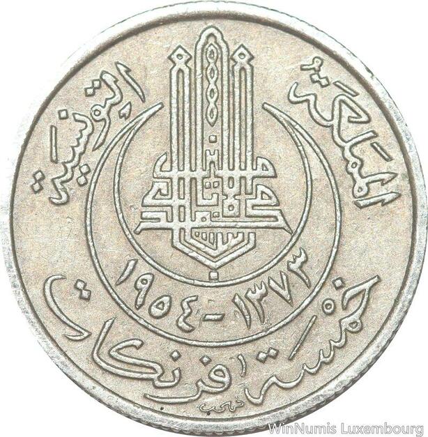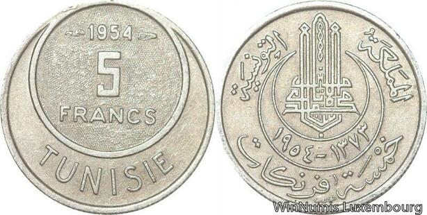 R8093 Tunisia 5 Francs Muhammad al-Amin Bey AH 1373 1954 Paris