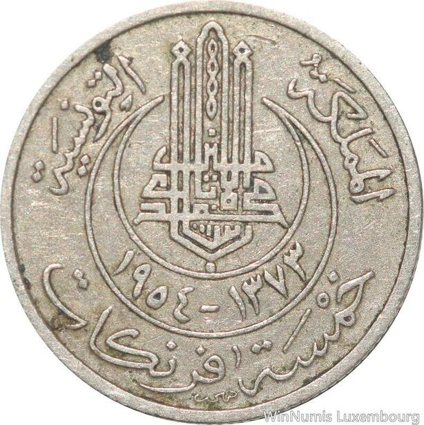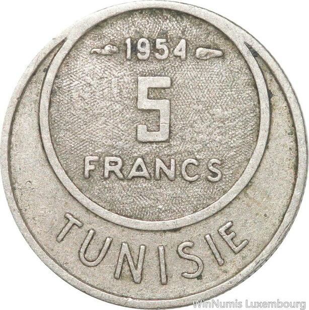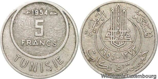 R8094 Tunisia 5 Francs Muhammad al-Amin Bey AH 1373 1954 Paris