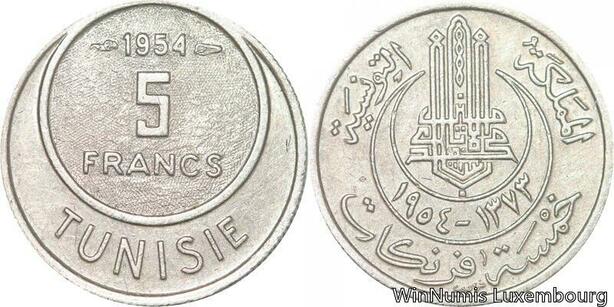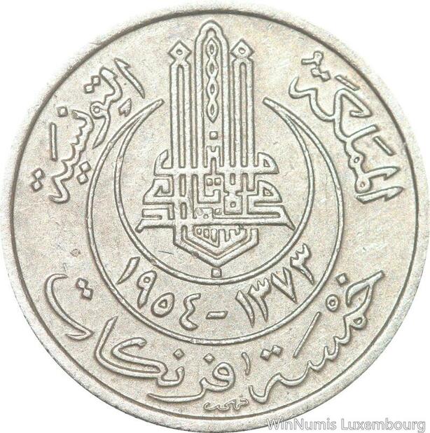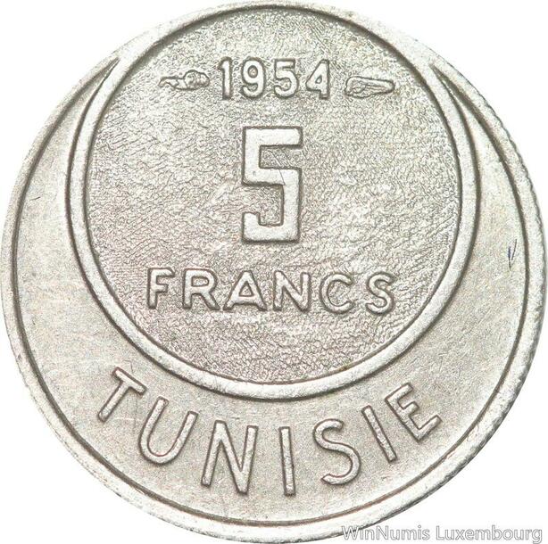 R8096 Tunisia 5 Francs Muhammad al-Amin Bey AH 1373 1954 Paris AU